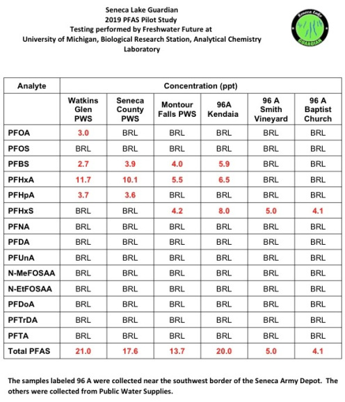 SLG had provided local water samples to a University of Michigan lab to screen for 14 PFAS chemicals in much the same way homeowners use radon kits to screen for radon in their basements. SLG reported a combined total of 21.0 parts per trillion for Watkins Glen, 17.6 ppt for Waterloo and 13.7 ppt for Montour Falls.