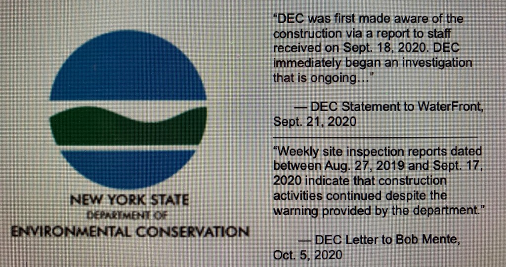 In a Sept. 21 statement to WaterFront, the DEC said it “was first made aware of the (building) construction via a report to staff received Sept. 18, 2020. DEC immediately began an investigation….”