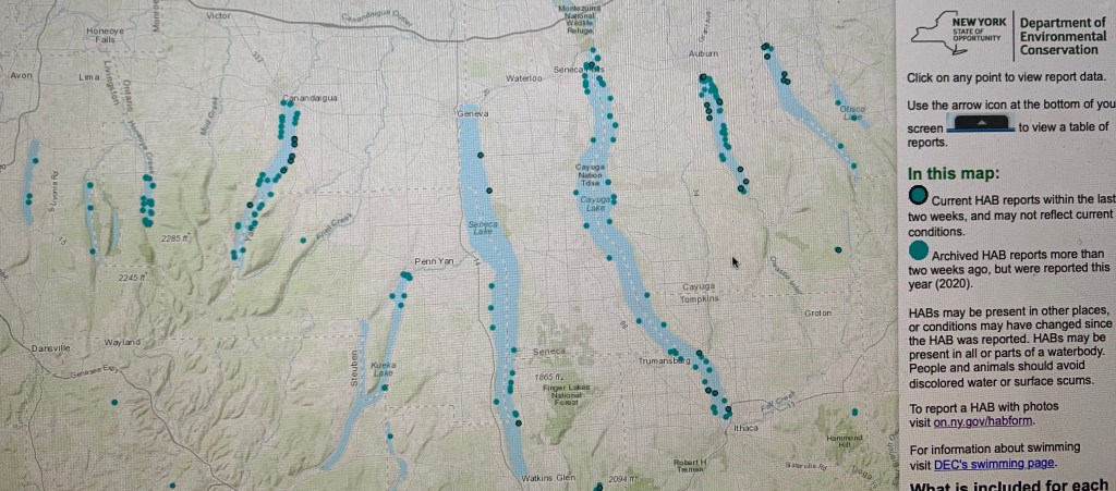Roege of SLPWA said this year’s blooms on Seneca were concentrated in the south central area rather than in the lake’s normally hard-hit northwestern quadrant. DEC records show no HABs around the Keuka Outlet in Dresden or Kashong Point between Dresden and Geneva.