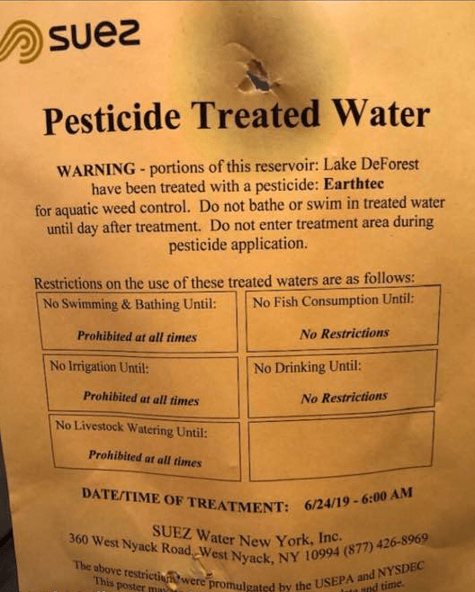 In Clarkston, N.J., Suez North America, treated its Lake DeForest Reservoir with EarthTec, for aquatic weed control. Its posted warning against swimming alarmed some locals.