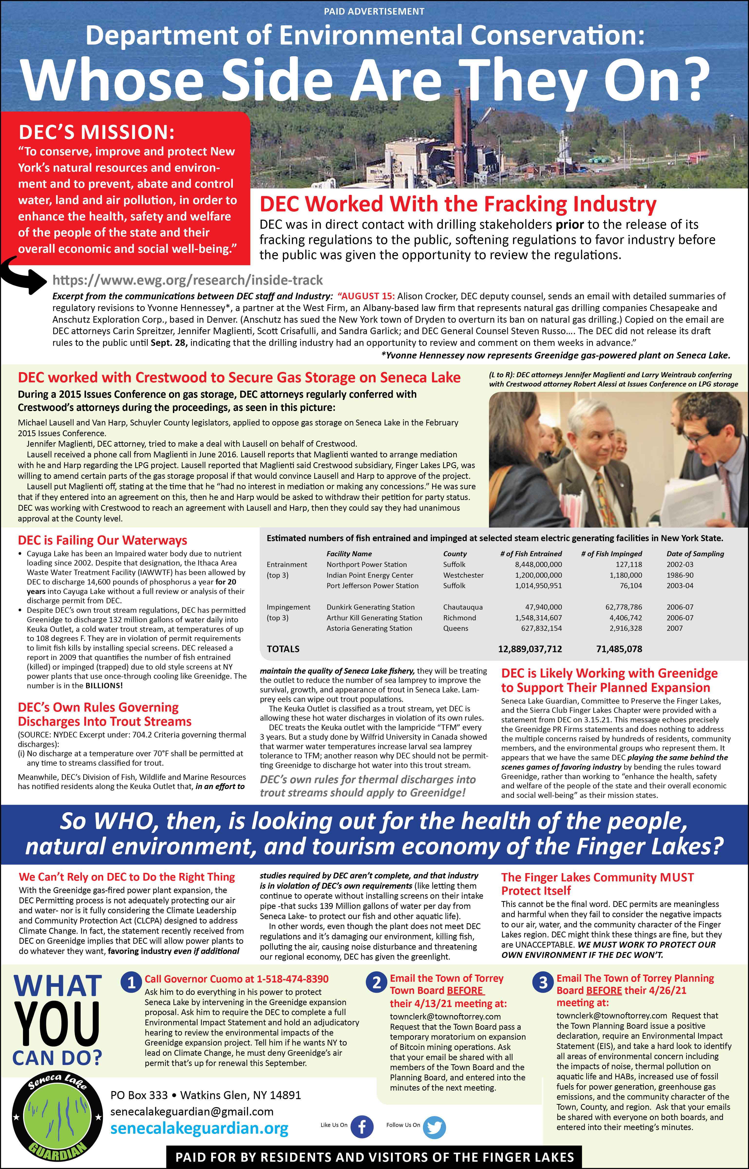The agency also allowed the plant to withdraw up to 139 million gallons of water a day from Seneca Lake — without federally required screens to protect aquatic life — and to discharge up to 134 million gallons a day into Keuka Outlet at temperatures up to 108 degrees.