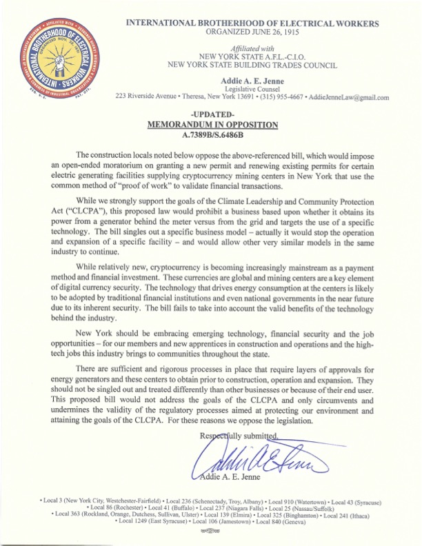 State Assembly Allowed IBEW to Veto Cryptocurrency Moratorium Bill to Preserve Union Jobs at Greenidge