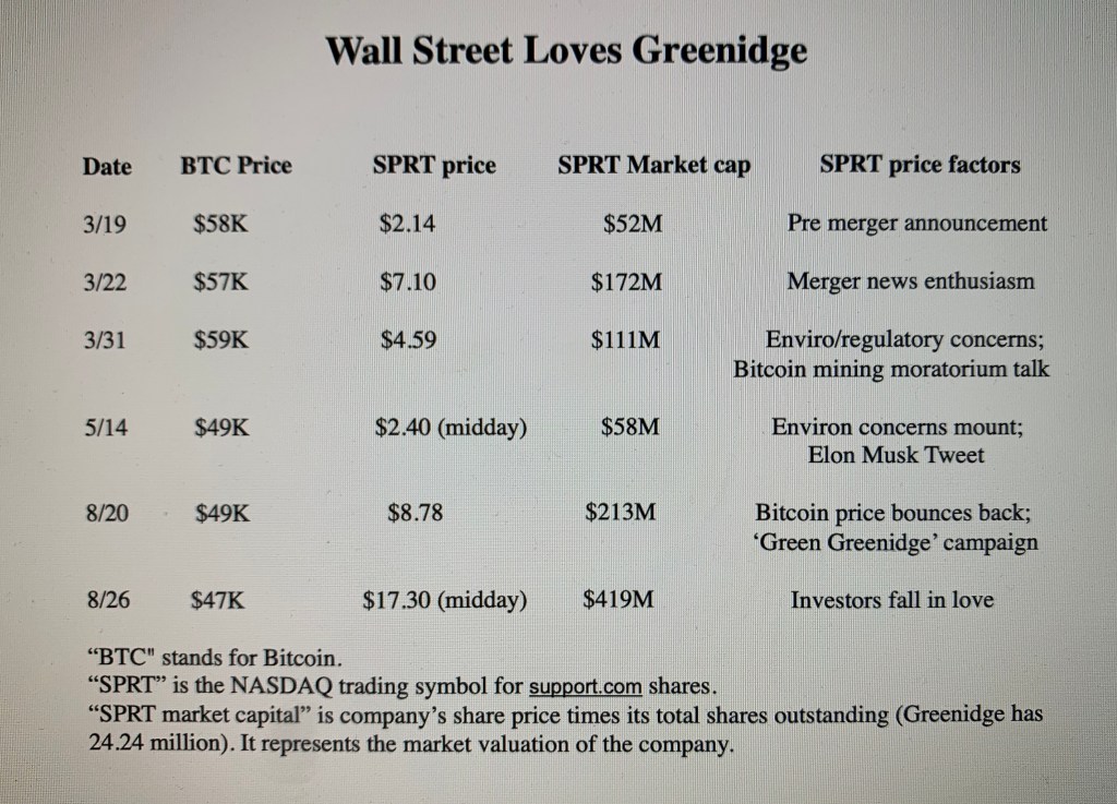 > Peter Mantius posted: ” DRESDEN, Aug. 26, 2021 — Wall Street has fallen in > love with Greenidge Generation’s story of “carbon neutral” Bitcoin mining. > Green Bitcoin mining or greenwashing? The market value of Greenidge’s > intended merger partner, Support.com, spurted to $39″ >
