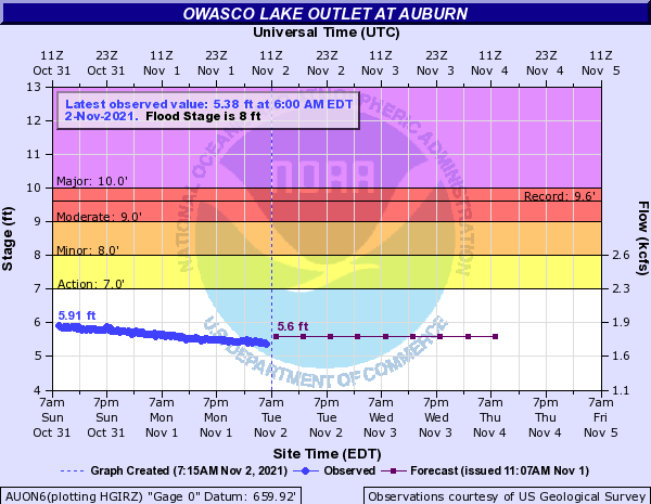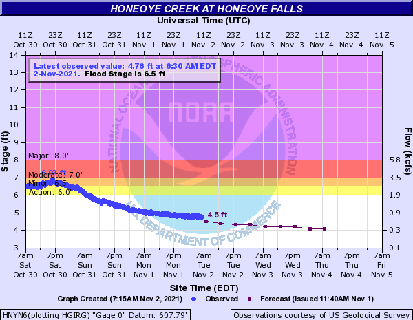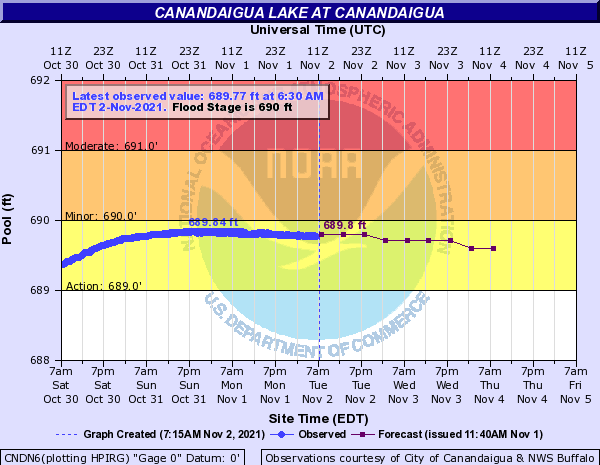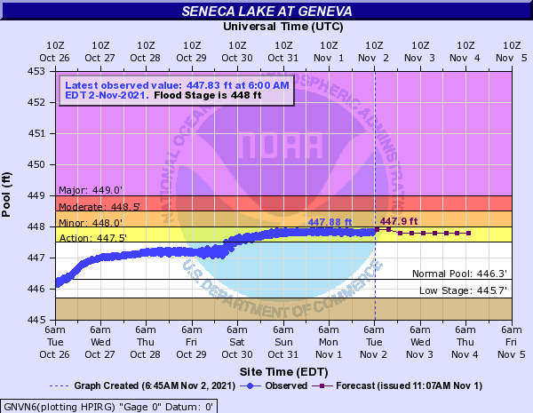 Last week’s rains and the extraordinary flow from Keuka Outlet pushed Seneca’s level from 446.1 feet on Oct. 26 to 447.9 feet a week later. It is expected to remain an inch or two below official flood stage of 448 feet at least until Thursday evening. Seneca’s record high of 448.95 feet was set on April 26, 1993.