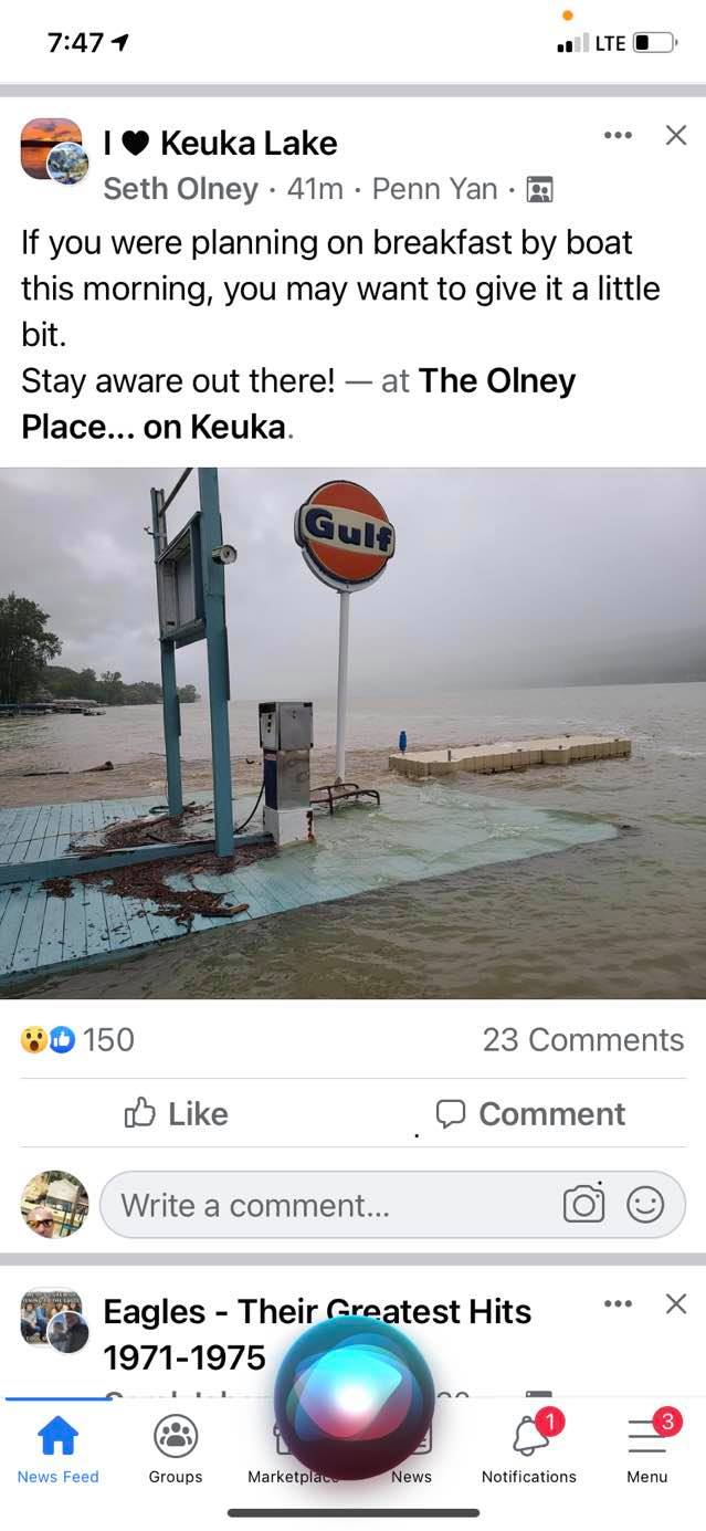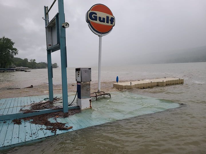 Although that’s six inches shy of official flood stage (716.5 feet), it was enough to cover the fueling dock at The Olney Place, eight miles south of Penn Yan on Keuka’s eastern arm.