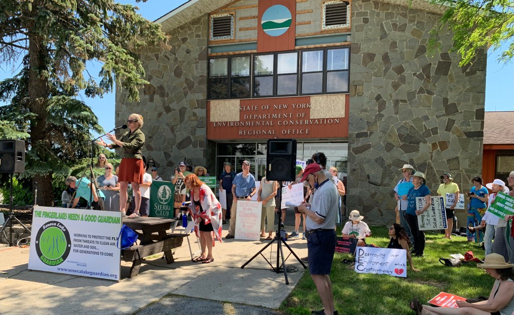 State Assembly Member Anna Kelles advocates statewide moratorium of “proof-of-work” crypto mining at June 5, 2021 rally at DEC regional offices in Avon.