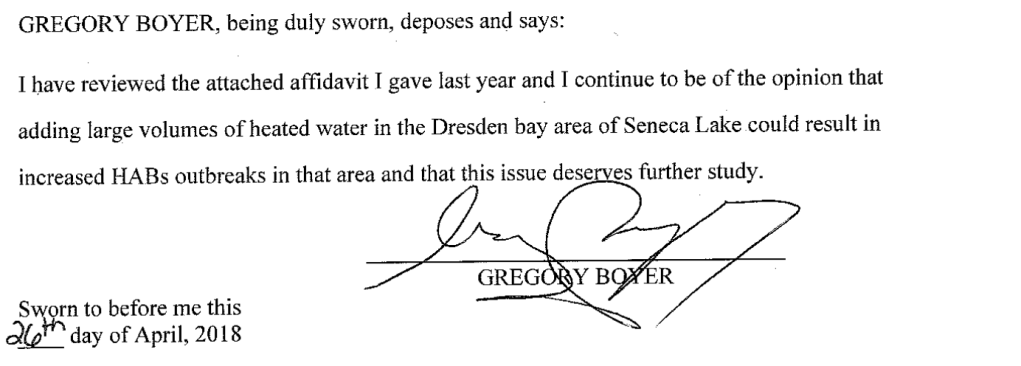 In that case, Gregory Boyer, a SUNY-ESF biochemist, filed an affidavit stating that “adding large volumes of heated water in the Dresden bay area of Seneca Lake could result in increased HABs outbreaks in that area….”