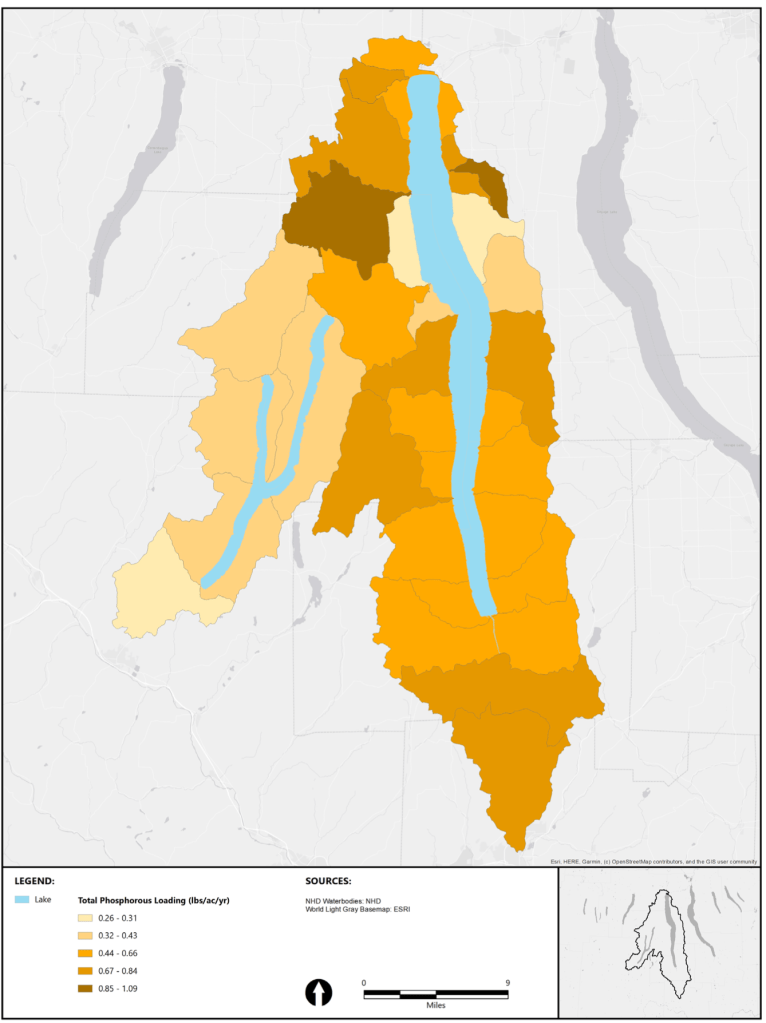More than 70 percent of the watershed’s phosphorus load is traceable to land dedicated to cultivated crops or hay/pasture. Those farmlands make up about 46 percent of the watershed’s acreage.