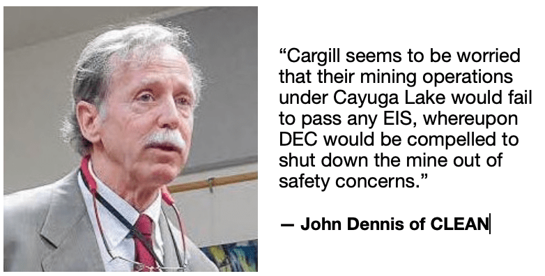 “Cargill seems to be worried that their mining operations under Cayuga Lake would fail to pass any EIS, whereupon DEC would be compelled to shut down the mine out of safety concerns,” Dennis said.
