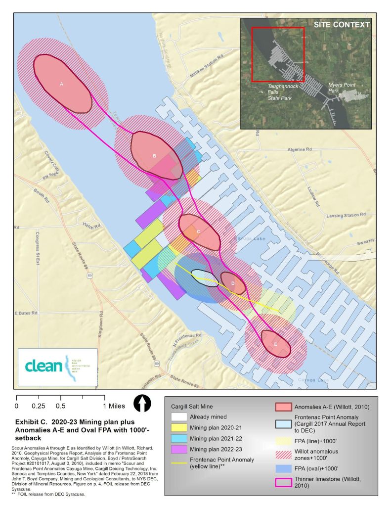 In February 2021, DEC announced “mostly housekeeping changes” to Cargill’s state permit that included a ban on mining within 1,000 feet of the so-called Frontenac Point Anomaly (FPA). The DEC declined a request from WaterFront to provide the FPA’s precise boundaries or to specify its location, size or shape. Instead it provided four letters from Cargill.