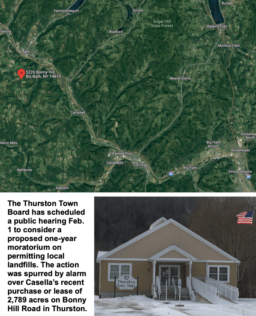THURSTON, Jan. 24, 2023 — A rural community in Steuben County is weighing a one-year local moratorium on permits for new landfills in response to news that Casella Waste Systems Inc. recently acquired or leased 2,789 acres of a local sewage sludge spreading operation.