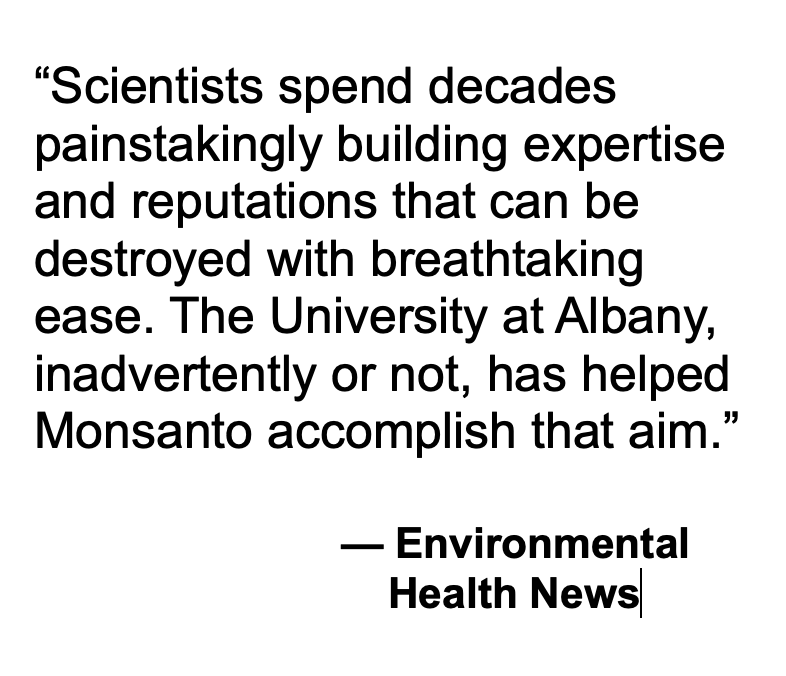 “Scientists spend decades painstakingly building expertise and reputations that can be destroyed with breathtaking ease,” EHN wrote. “The University at Albany, inadvertently or not, has helped Monsanto accomplish that aim.”