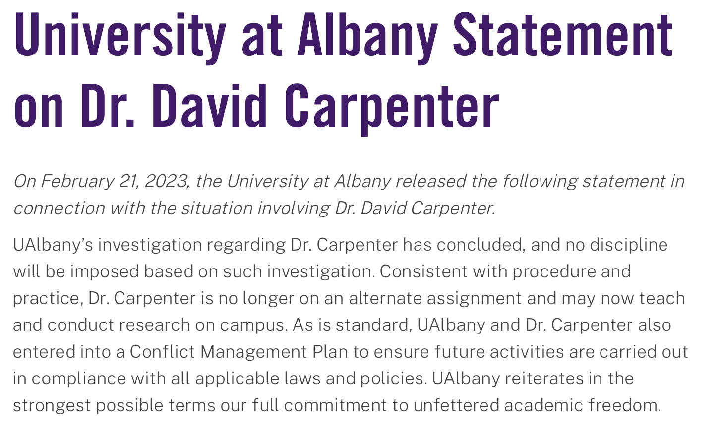 Only hours after UAlbany’s Senate received a formal complaint alleging violations of Carpenter’s academic freedom, university officials abruptly ended an investigation launched last spring into fees he had received as an expert. They said they would not impose any discipline related to that probe.