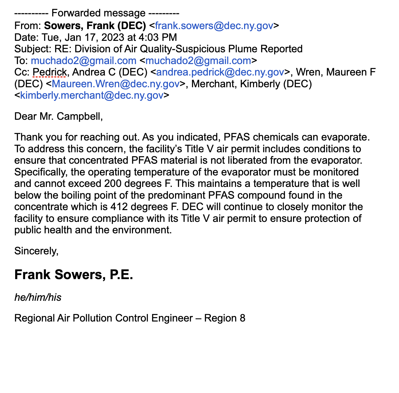 In response, the DEC’s Frank Sowers acknowledged that PFAS chemicals can evaporate, but he dismissed SLG’s concerns. “The facility’s Title V air permit includes conditions to ensure that concentrated PFAS material is not liberated from the evaporator,” Sowers said in a Jan. 19 email to SLG.