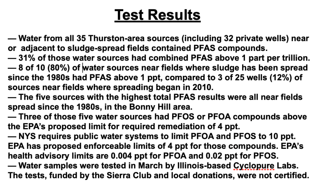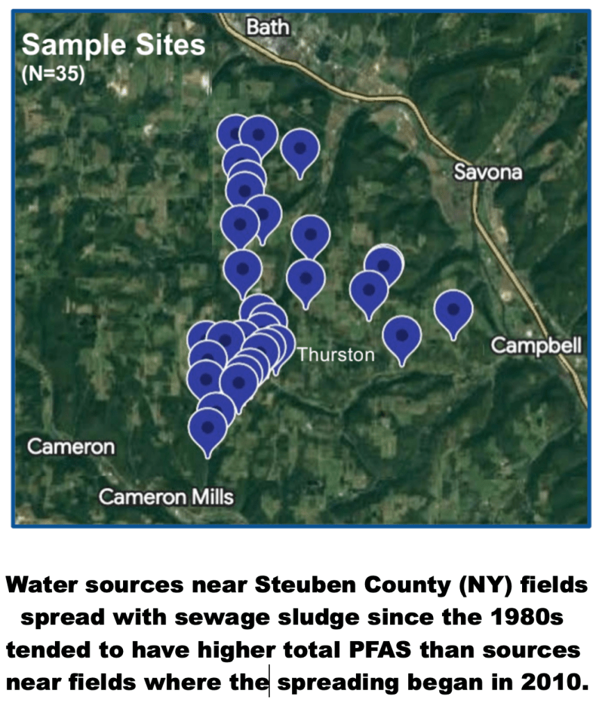 THURSTON, Apr. 20, 2023 — Every water sample from 32 private wells near or adjacent to Steuben County fields that have been spread with municipal sewage sludge contained PFAS chemicals, recent independent testing found.