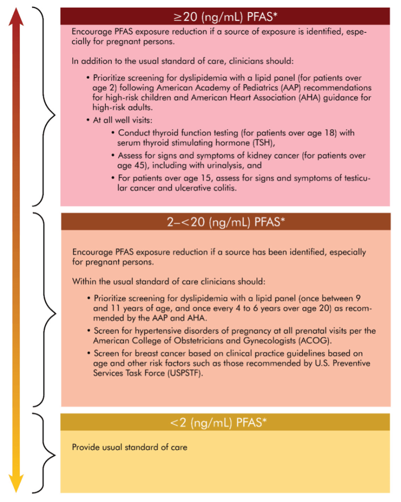When PFAS blood levels exceed 20 ppt, clinicians should encourage patients to identify and reduce PFAS exposure, the NAS reported last July. In addition, it recommended that those patients should be screened for thyroid problems, given urine tests for kidney cancer and assessed for signs of testicular cancer and ulcerative colitis.