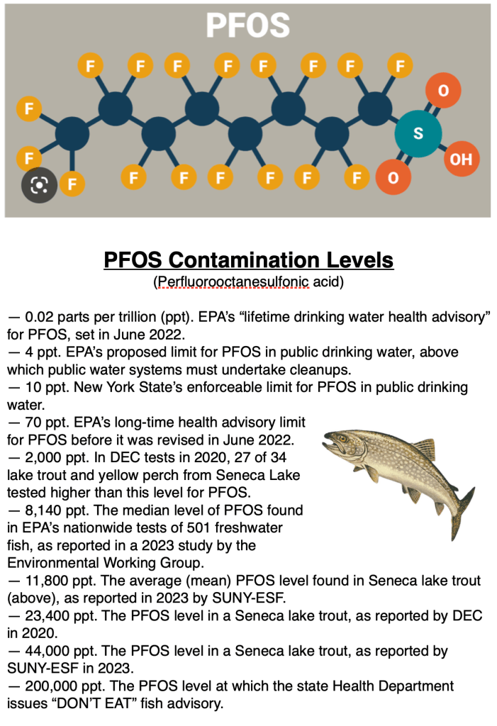 By contrast, Seneca lake trout were found to have, on average, total PFAS chemicals of 26,100 ppt. The mean level of PFOS alone was 11,800 ppt.