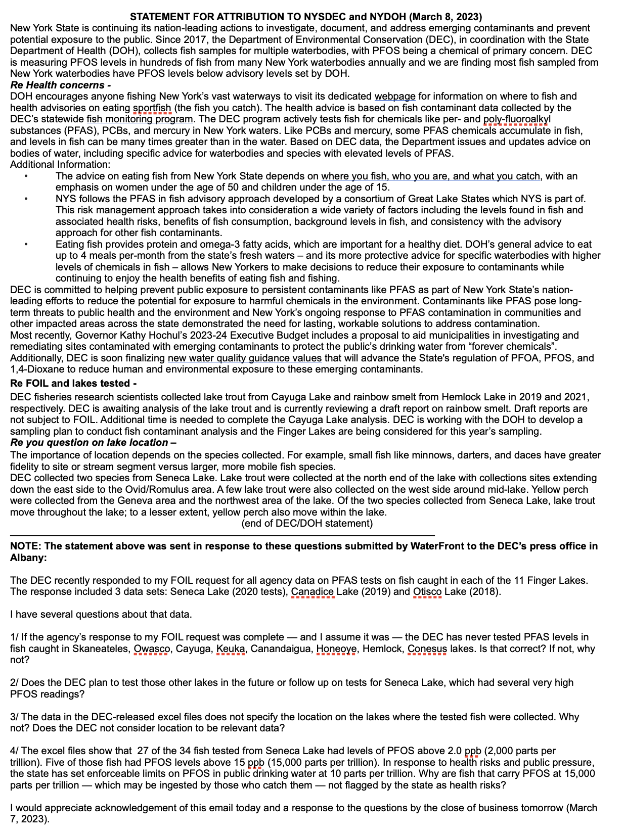 So far, New York State has very limited data on PFAS compounds in fish in the Finger Lakes, and the DOH’s regional fish advisory ignores them entirely.