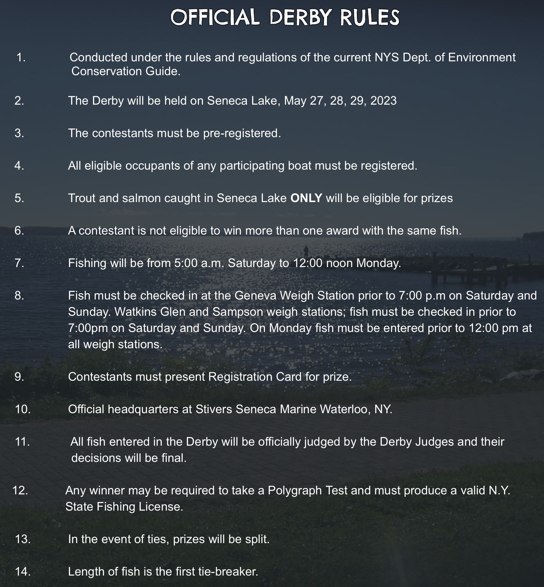 GENEVA, May 1, 2023 — This coming Memorial Day weekend, anglers will converge on Geneva — the so-called “Lake Trout Capital of the World” — to compete in Seneca Lake’s 59th annual National Lake Trout Derby.