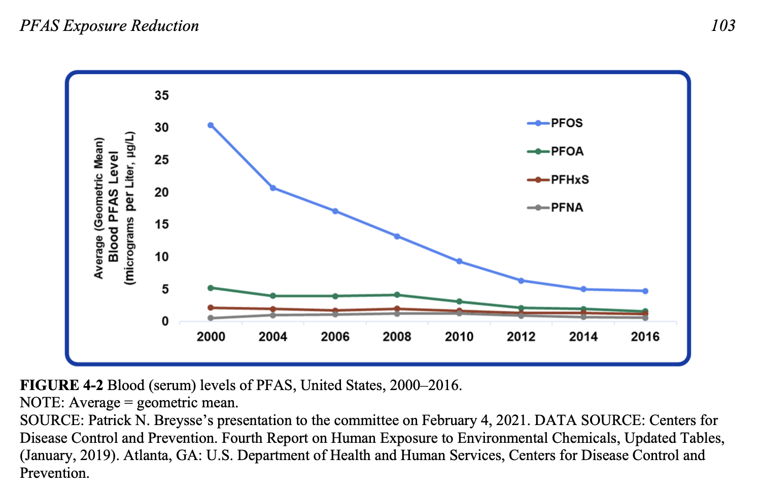 Razavi noted that PFOS levels in Americans’ blood have declined sharply in recent years, presumably because 3M began phasing out the manufacture of its product 20-odd years ago.
