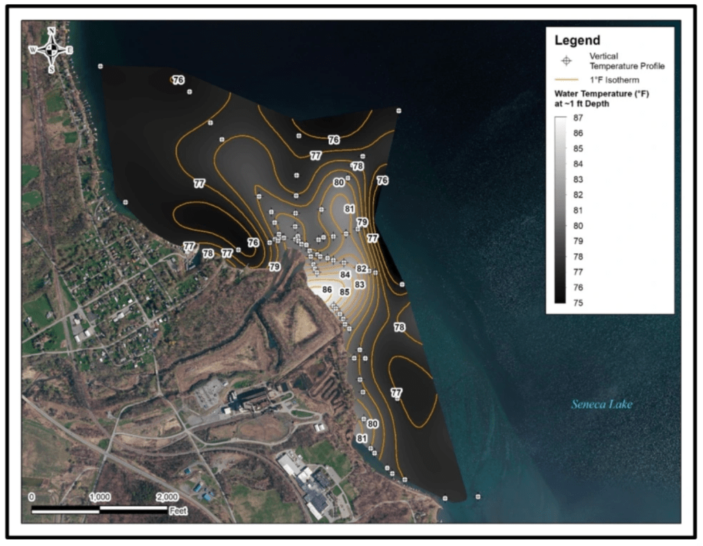 Surveys of water temperatures around the outlet have shown that lake water temperatures far exceed the state’s three degree limit for artificial warming. Greenidge obtained a state wavier from that rule.