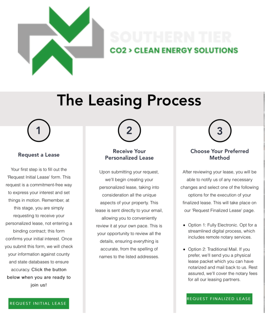 Southern Tier CO2 to Clean Energy Solutions LLC is pursuing leases from landowners who own at least 30 acres in Broome, Tioga and Chemung counties. It recently mailed 6,500 information packages inviting people to sign up for what it hopes will be a massive carbon capture project.
