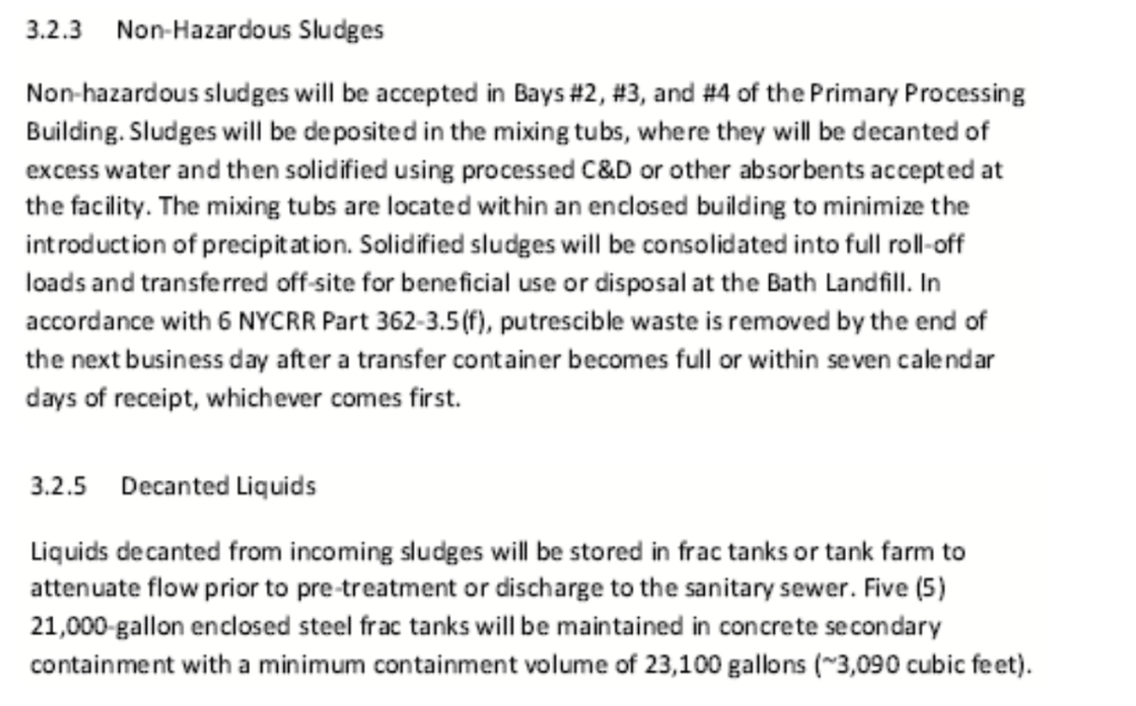 “Sludges will be … decanted of excess water and then solidified using processed C&D or other absorbents,” the application documents state. “Solidified sludges will be … transferred off-site for beneficial use or disposal at the Bath Landfill … Liquids decanted from incoming sludges will be stored in frac tanks or tank farm to attenuate flow prior to pre-treatment or discharge in the sanitary sewer.”