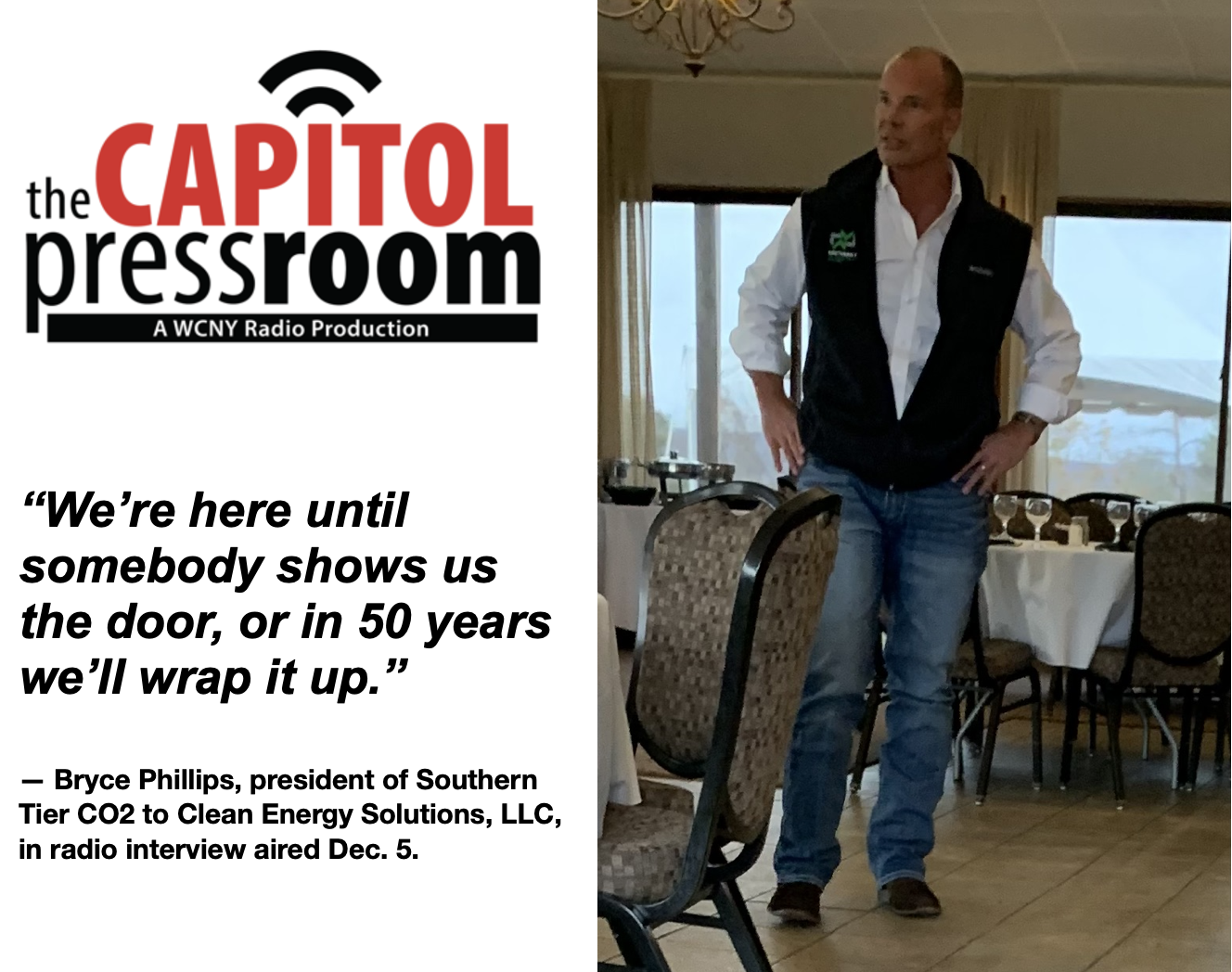 Phillips, a 56-year-old Texan, sounded more open about his professional team in a pre-taped radio interview aired Tuesday on Albany-based WCNY’s Capitol Pressroom program. When asked to describe his backers, he told the radio audience, that his company was owned by CO2 To Clean Energy Solutions “out of Wyoming.”