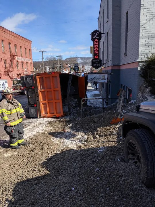 The driver of this sand and gravel truck was sent to the hospital after his crash at the sharp turn near the bottom of Route 409 in Watkins Glen.