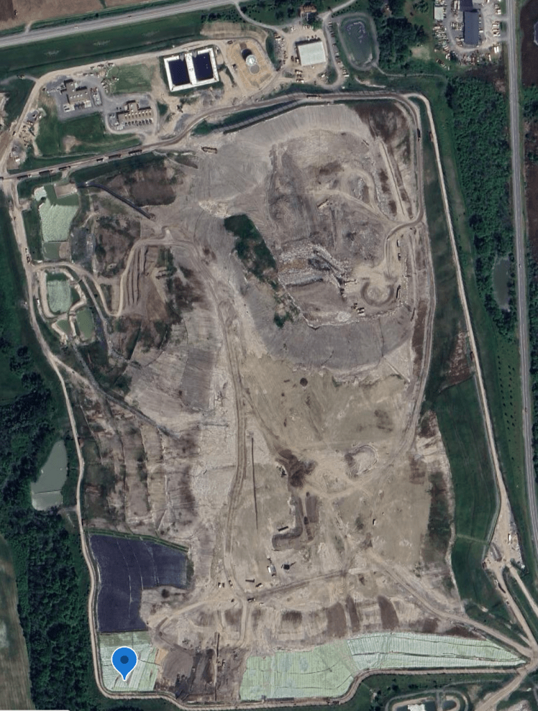 The blue marker shows the location of the November 2023 landslide at the Ontario County Landfill.