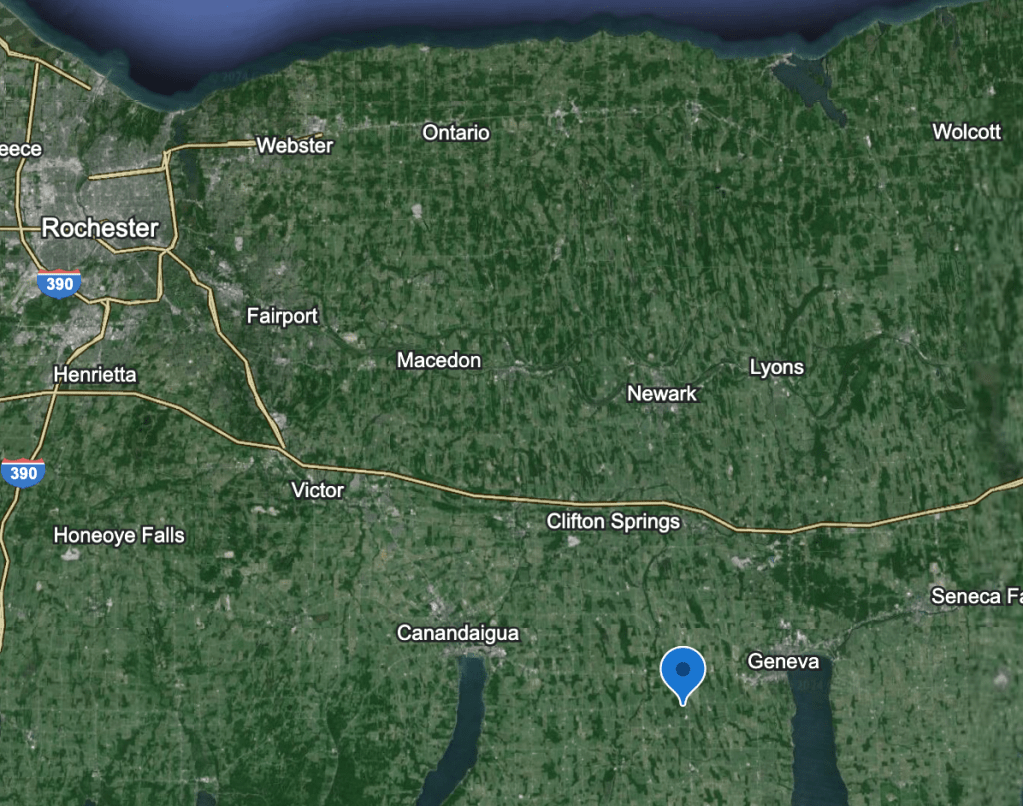 The Ontario County Landfill (blue marker) is located about five miles west of Geneva and 35 miles southeast of Rochester.