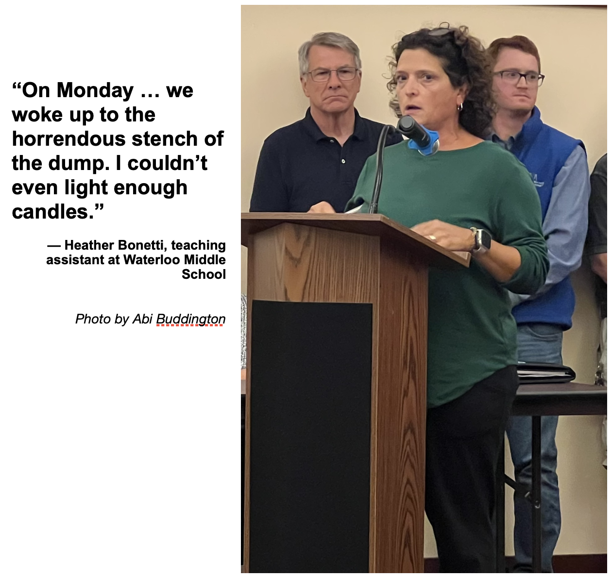 “On Monday… we woke up to the horrendous stench of the dump,” Heather Bonetti, a teaching assistant at Waterloo Middle School, told the town board Tuesday. “I couldn’t even light enough candles … Happy Labor Day, the last day of summer before I have to go back to school.”