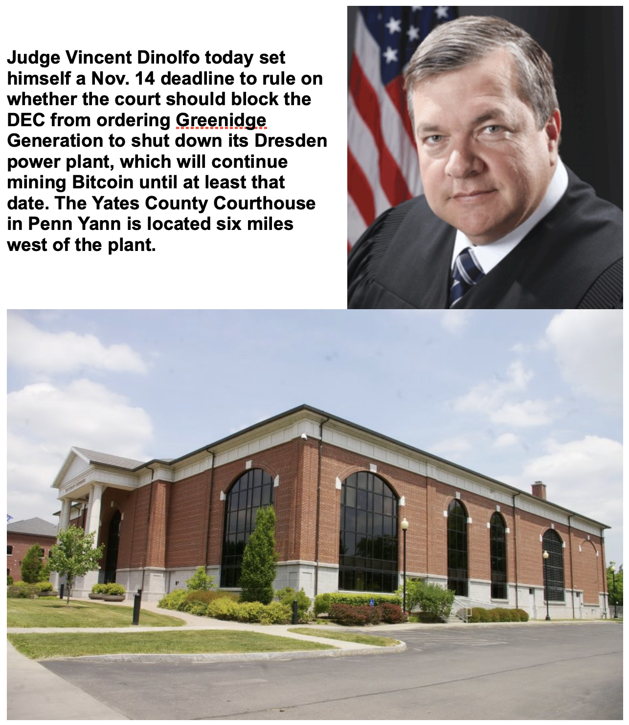 PENN YAN, Oct. 29, 2024 — At a hearing in Yates County Supreme Court this morning, Judge Vincent Dinolfo committed to ruling by Nov. 14 on Greenidge Generation LLC’s request to block a state order to permanently shut down its Dresden power plant.